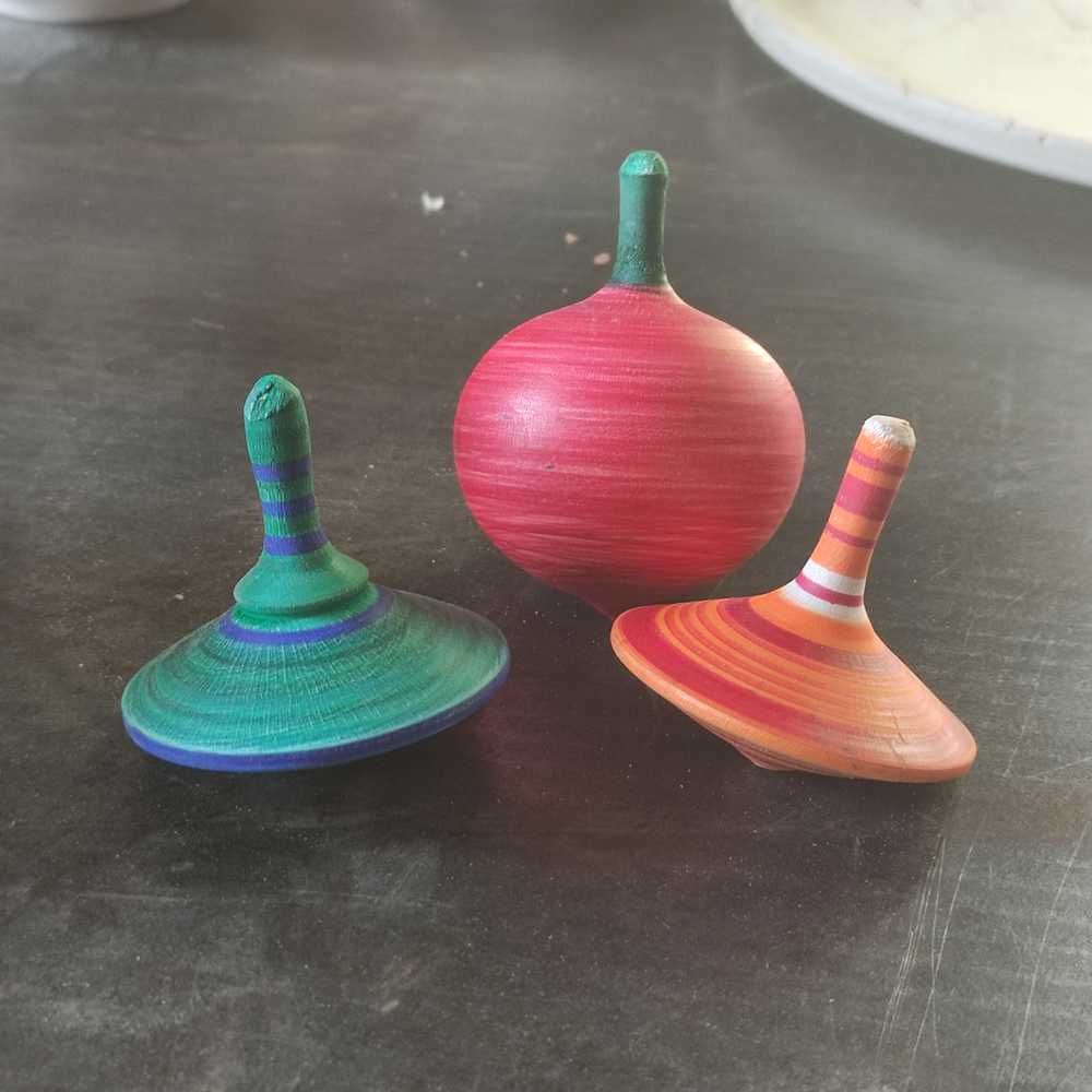 Egyszerűbb, játékos apró tárgyakat (pörgettyű, fatojás, gomba, tulipán) tervezünk a gyerekekkel közösen készíteni és színezni.